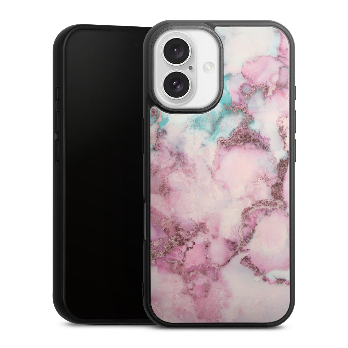 We print your design on the back of the glass inlay and then connect it firmly to the silicone case ,so that nothing sticks out and everything looks like it was cast from one piece. In addition, the sturdy glass element is protected from scratches by an additional coating and ensures a slight reflection on the shiny print image.
