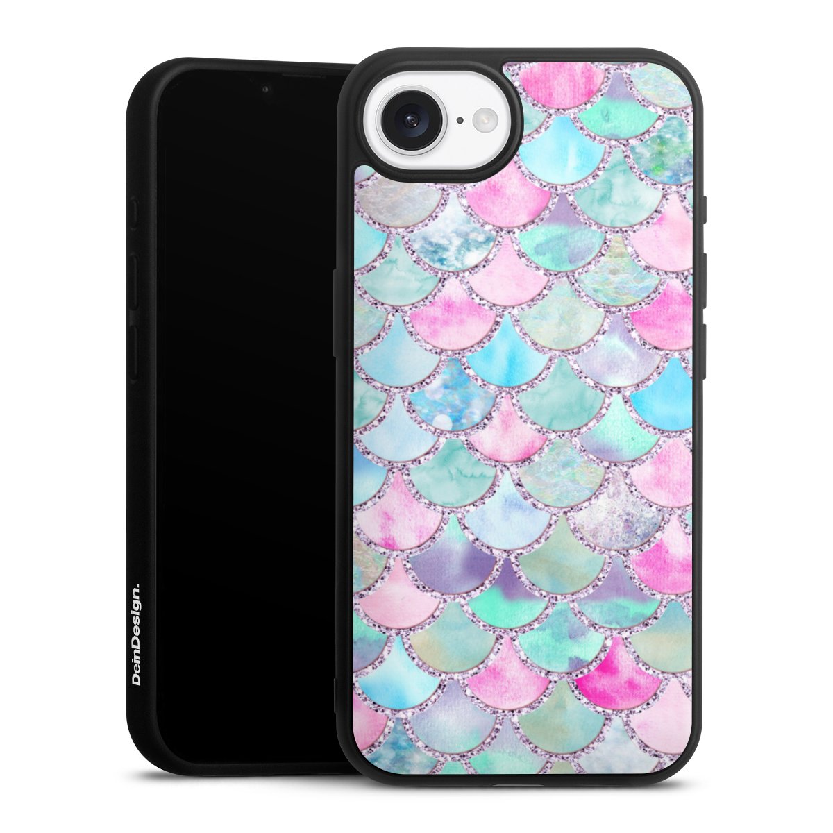 We print your design on the back of the glass inlay and then connect it firmly to the silicone case ,so that nothing sticks out and everything looks like it was cast from one piece. In addition, the sturdy glass element is protected from scratches by an additional coating and ensures a slight reflection on the shiny print image.