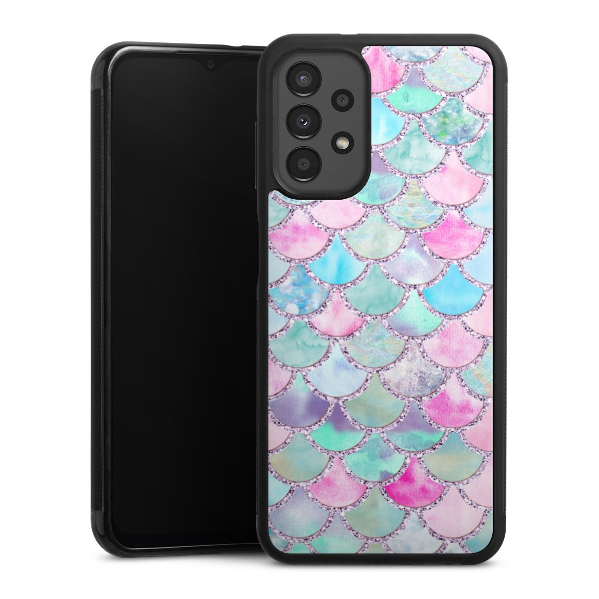 We print your design on the back of the glass inlay and then connect it firmly to the silicone case ,so that nothing sticks out and everything looks like it was cast from one piece. In addition, the sturdy glass element is protected from scratches by an additional coating and ensures a slight reflection on the shiny print image.