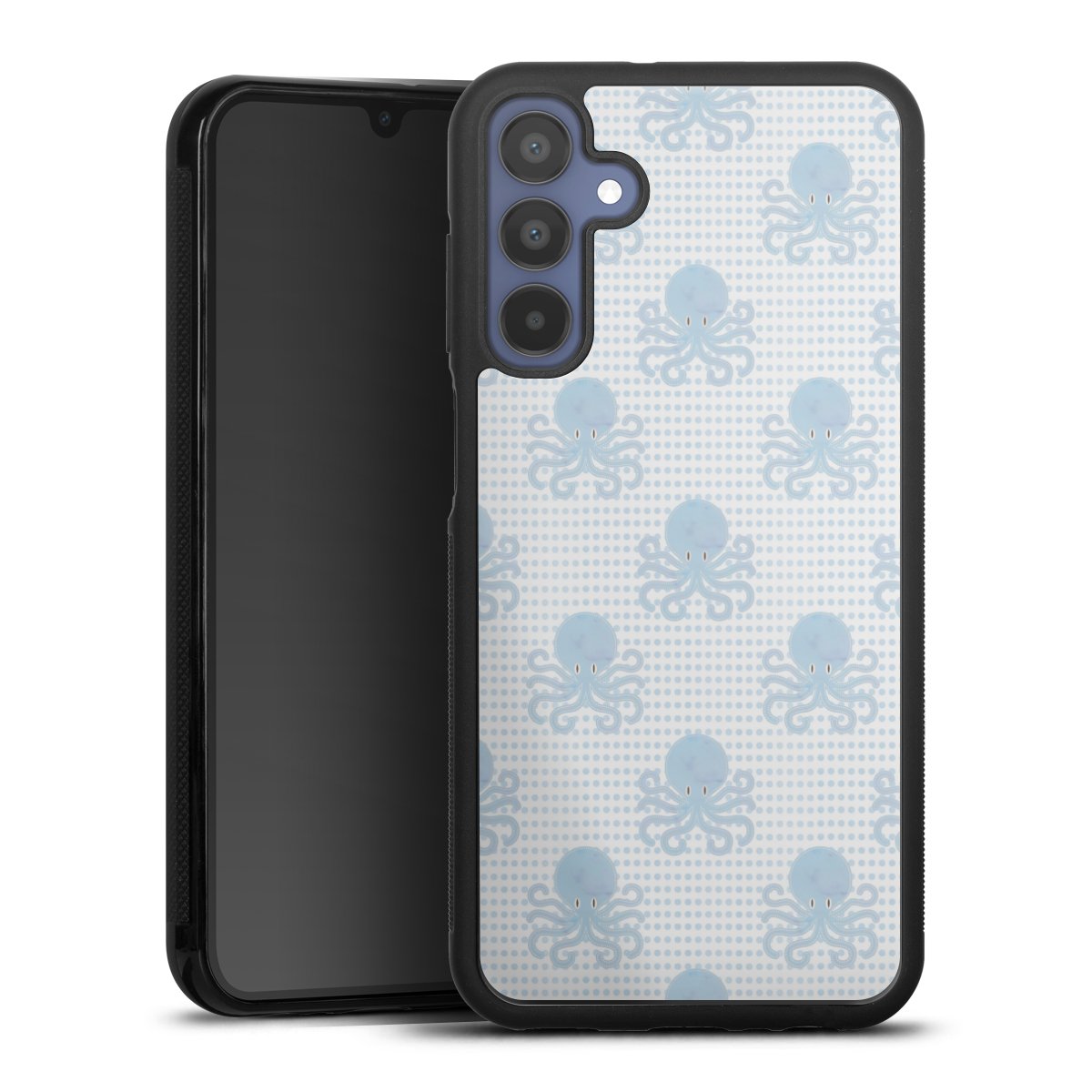 We print your design on the back of the glass inlay and then connect it firmly to the silicone case ,so that nothing sticks out and everything looks like it was cast from one piece. In addition, the sturdy glass element is protected from scratches by an additional coating and ensures a slight reflection on the shiny print image.