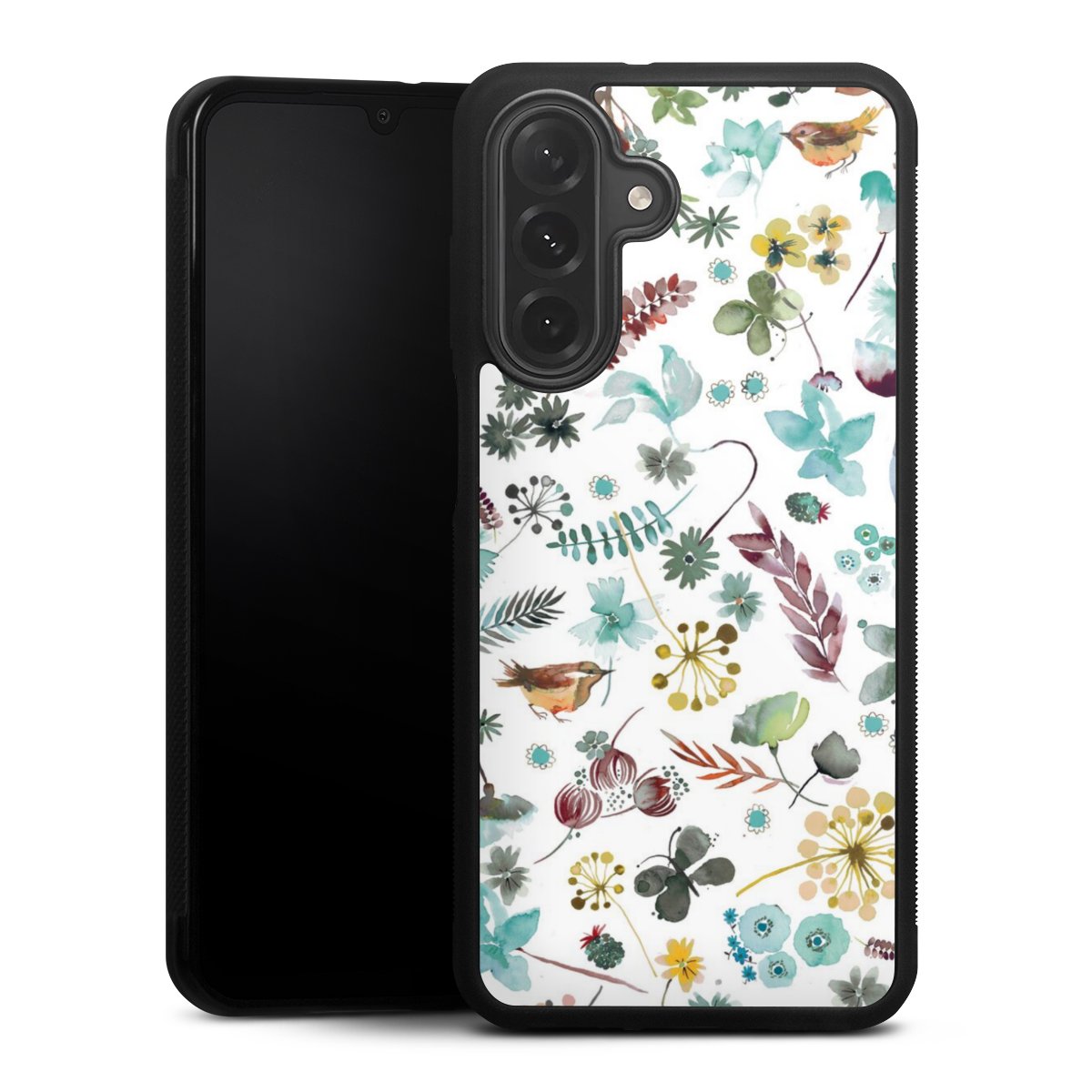 We print your design on the back of the glass inlay and then connect it firmly to the silicone case ,so that nothing sticks out and everything looks like it was cast from one piece. In addition, the sturdy glass element is protected from scratches by an additional coating and ensures a slight reflection on the shiny print image.