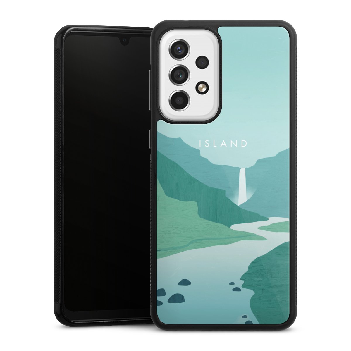 We print your design on the back of the glass inlay and then connect it firmly to the silicone case ,so that nothing sticks out and everything looks like it was cast from one piece. In addition, the sturdy glass element is protected from scratches by an additional coating and ensures a slight reflection on the shiny print image.