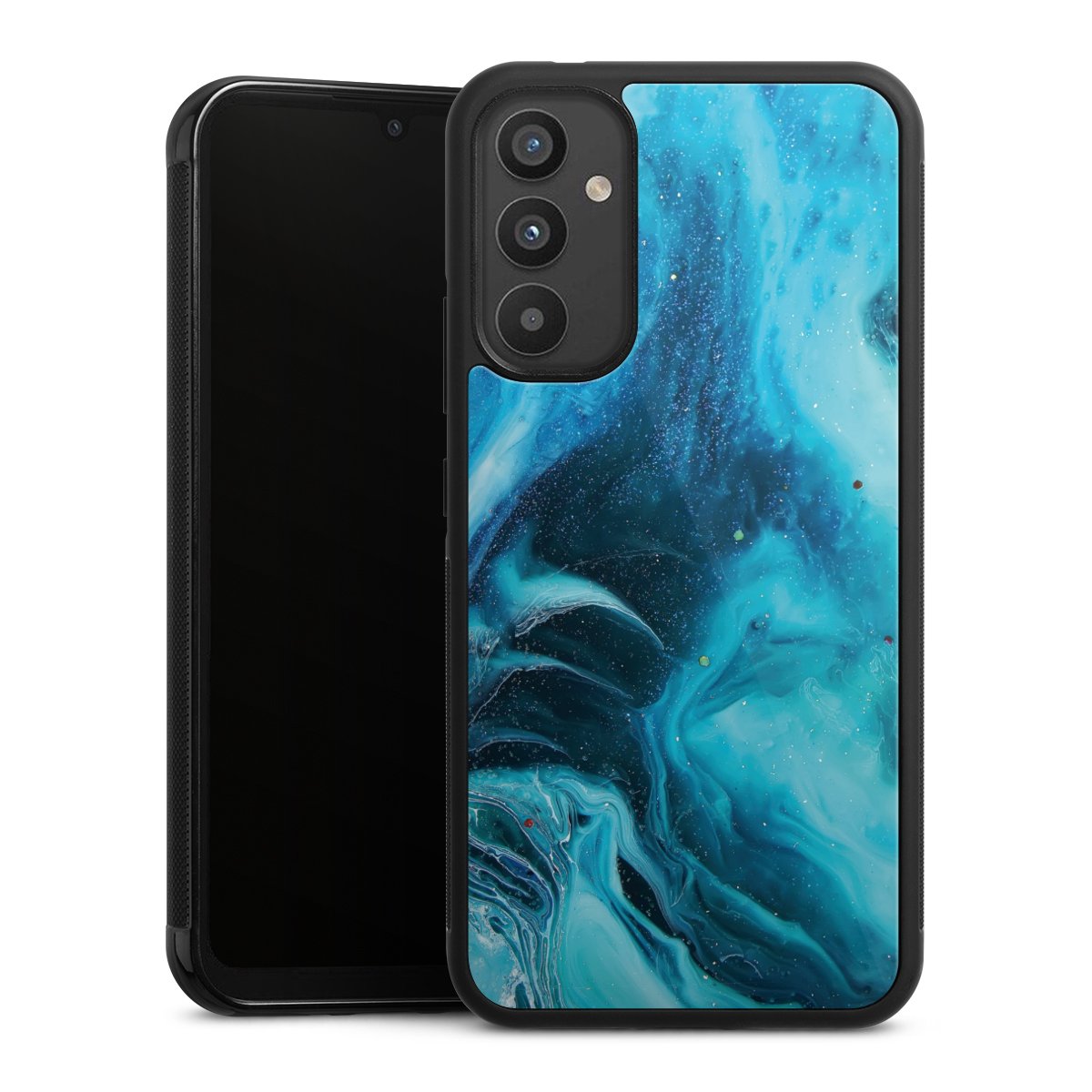 We print your design on the back of the glass inlay and then connect it firmly to the silicone case ,so that nothing sticks out and everything looks like it was cast from one piece. In addition, the sturdy glass element is protected from scratches by an additional coating and ensures a slight reflection on the shiny print image.