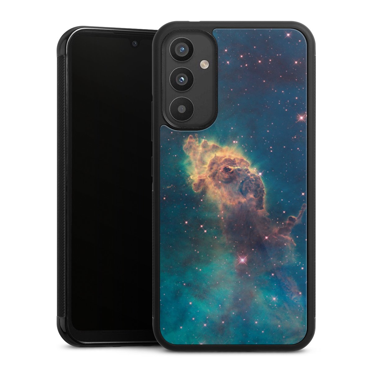 We print your design on the back of the glass inlay and then connect it firmly to the silicone case ,so that nothing sticks out and everything looks like it was cast from one piece. In addition, the sturdy glass element is protected from scratches by an additional coating and ensures a slight reflection on the shiny print image.