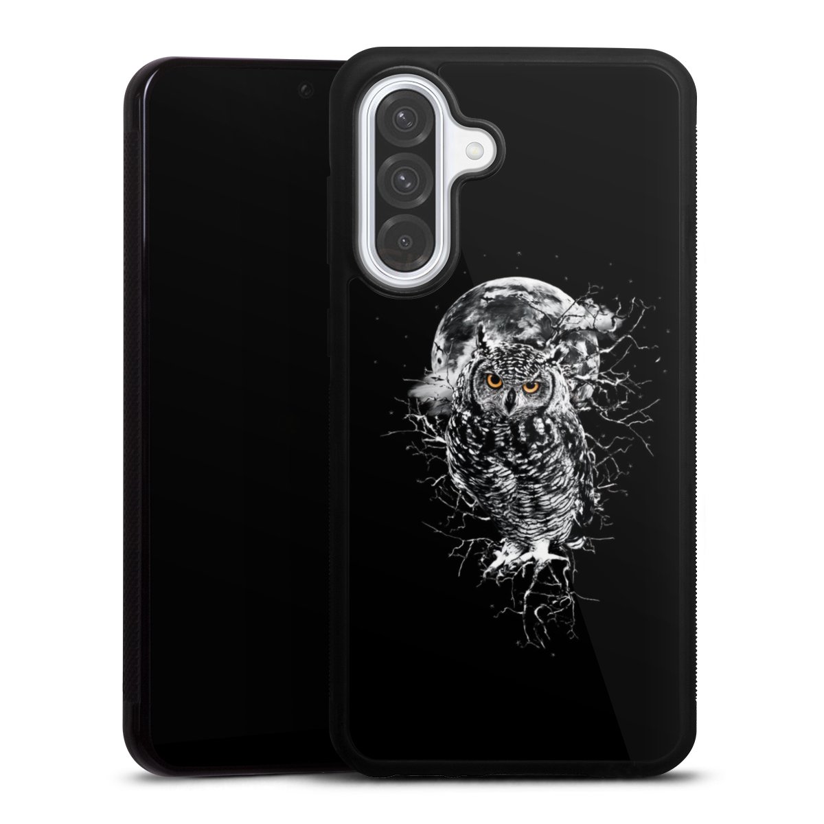We print your design on the back of the glass inlay and then connect it firmly to the silicone case ,so that nothing sticks out and everything looks like it was cast from one piece. In addition, the sturdy glass element is protected from scratches by an additional coating and ensures a slight reflection on the shiny print image.