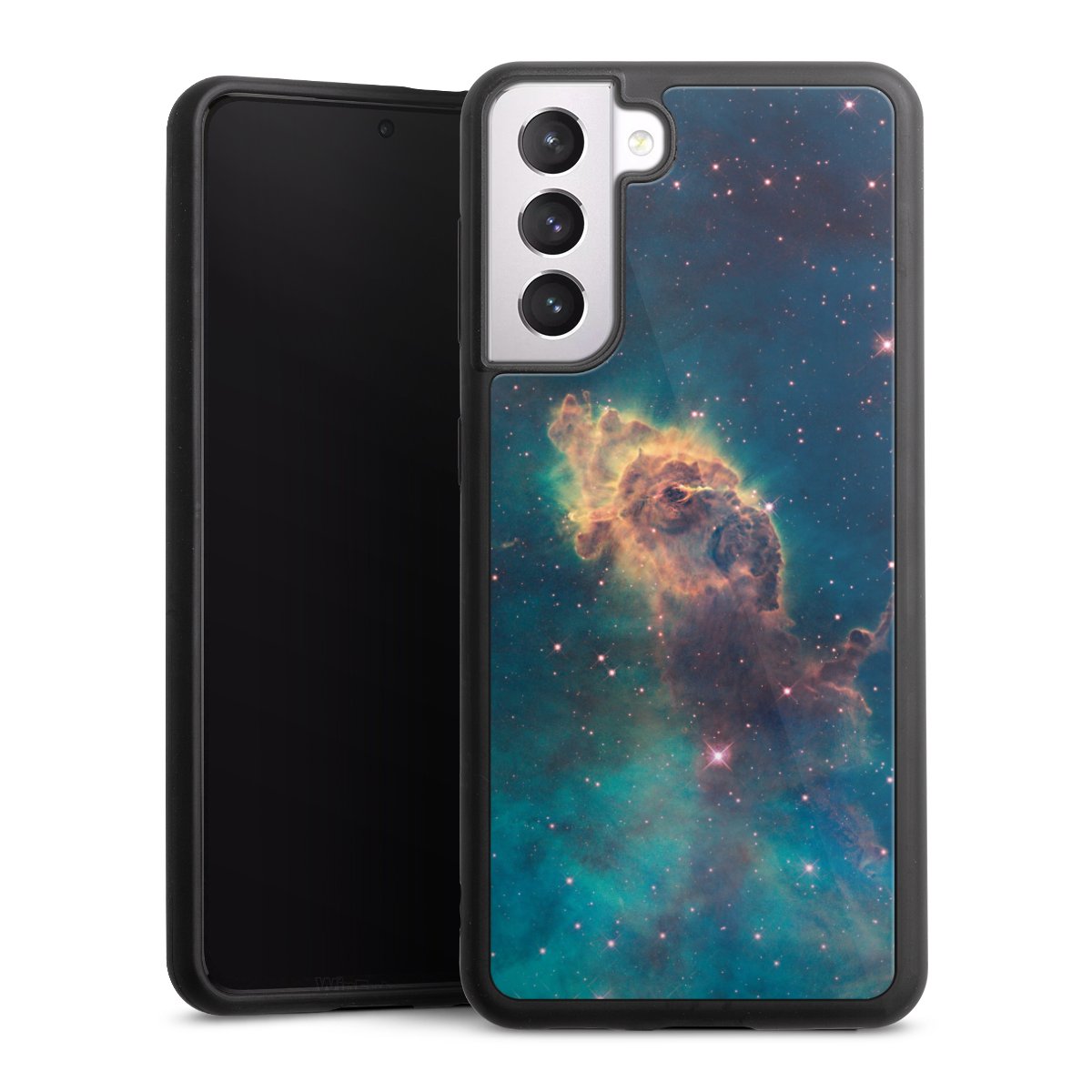 We print your design on the back of the glass inlay and then connect it firmly to the silicone case ,so that nothing sticks out and everything looks like it was cast from one piece. In addition, the sturdy glass element is protected from scratches by an additional coating and ensures a slight reflection on the shiny print image.