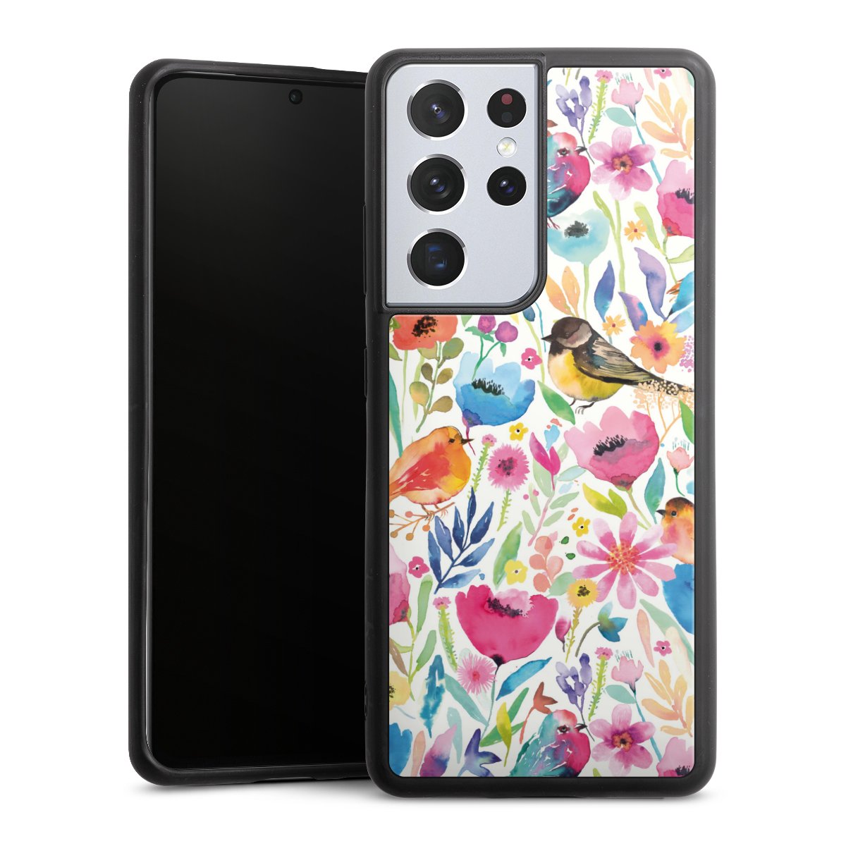 We print your design on the back of the glass inlay and then connect it firmly to the silicone case ,so that nothing sticks out and everything looks like it was cast from one piece. In addition, the sturdy glass element is protected from scratches by an additional coating and ensures a slight reflection on the shiny print image.