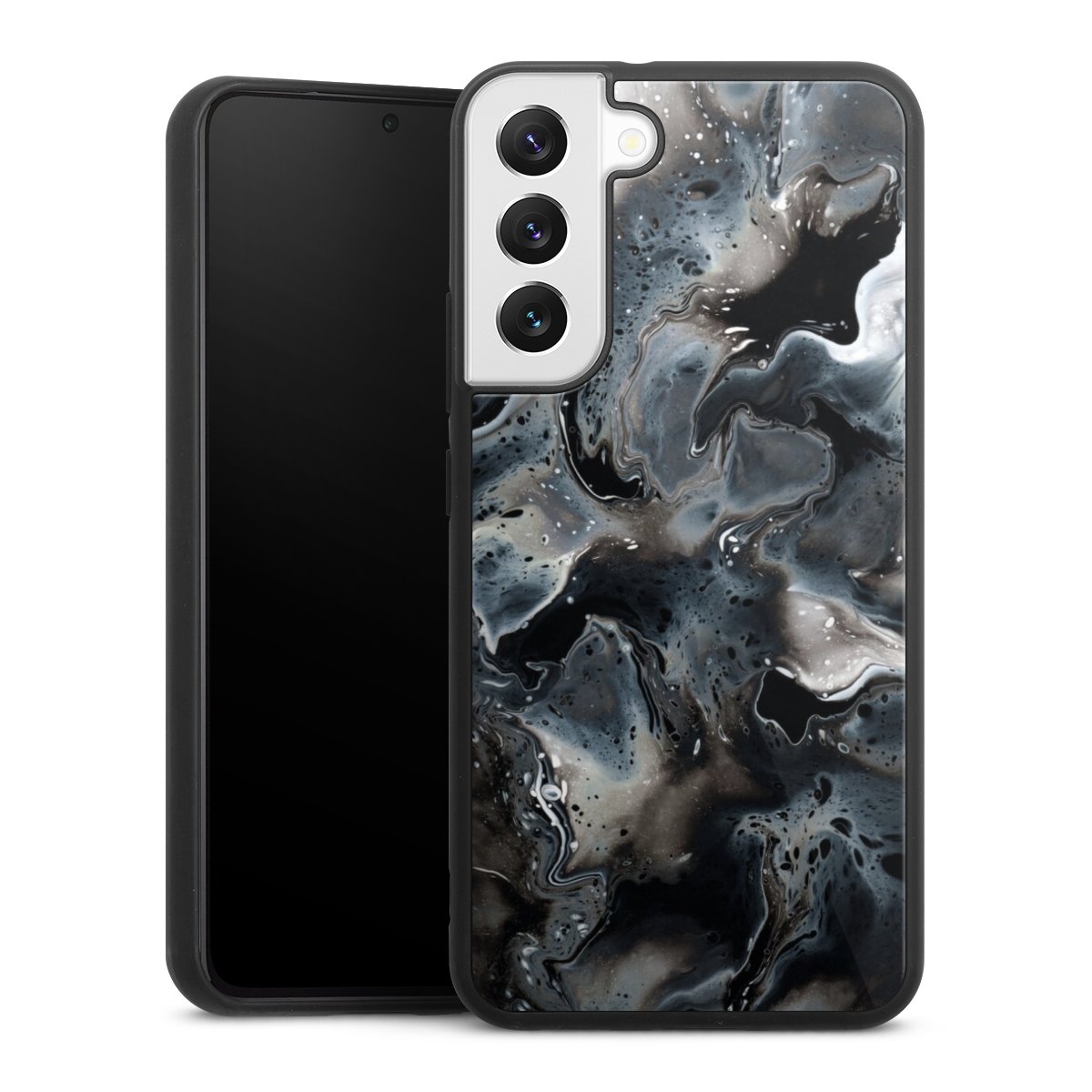 We print your design on the back of the glass inlay and then connect it firmly to the silicone case ,so that nothing sticks out and everything looks like it was cast from one piece. In addition, the sturdy glass element is protected from scratches by an additional coating and ensures a slight reflection on the shiny print image.