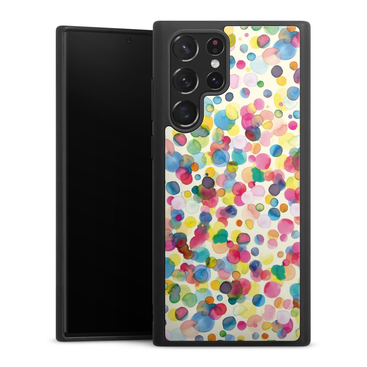 We print your design on the back of the glass inlay and then connect it firmly to the silicone case ,so that nothing sticks out and everything looks like it was cast from one piece. In addition, the sturdy glass element is protected from scratches by an additional coating and ensures a slight reflection on the shiny print image.