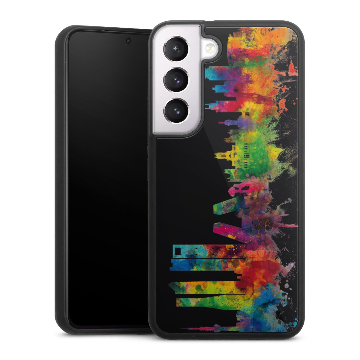 We print your design on the back of the glass inlay and then connect it firmly to the silicone case ,so that nothing sticks out and everything looks like it was cast from one piece. In addition, the sturdy glass element is protected from scratches by an additional coating and ensures a slight reflection on the shiny print image.