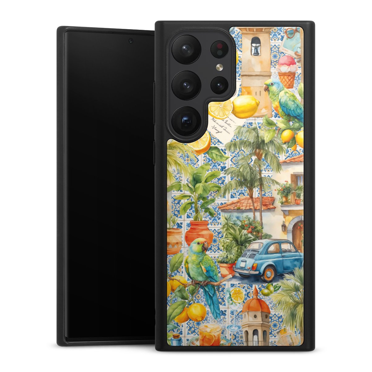 We print your design on the back of the glass inlay and then connect it firmly to the silicone case ,so that nothing sticks out and everything looks like it was cast from one piece. In addition, the sturdy glass element is protected from scratches by an additional coating and ensures a slight reflection on the shiny print image.