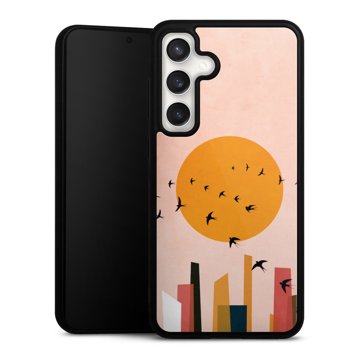 We print your design on the back of the glass inlay and then connect it firmly to the silicone case ,so that nothing sticks out and everything looks like it was cast from one piece. In addition, the sturdy glass element is protected from scratches by an additional coating and ensures a slight reflection on the shiny print image.