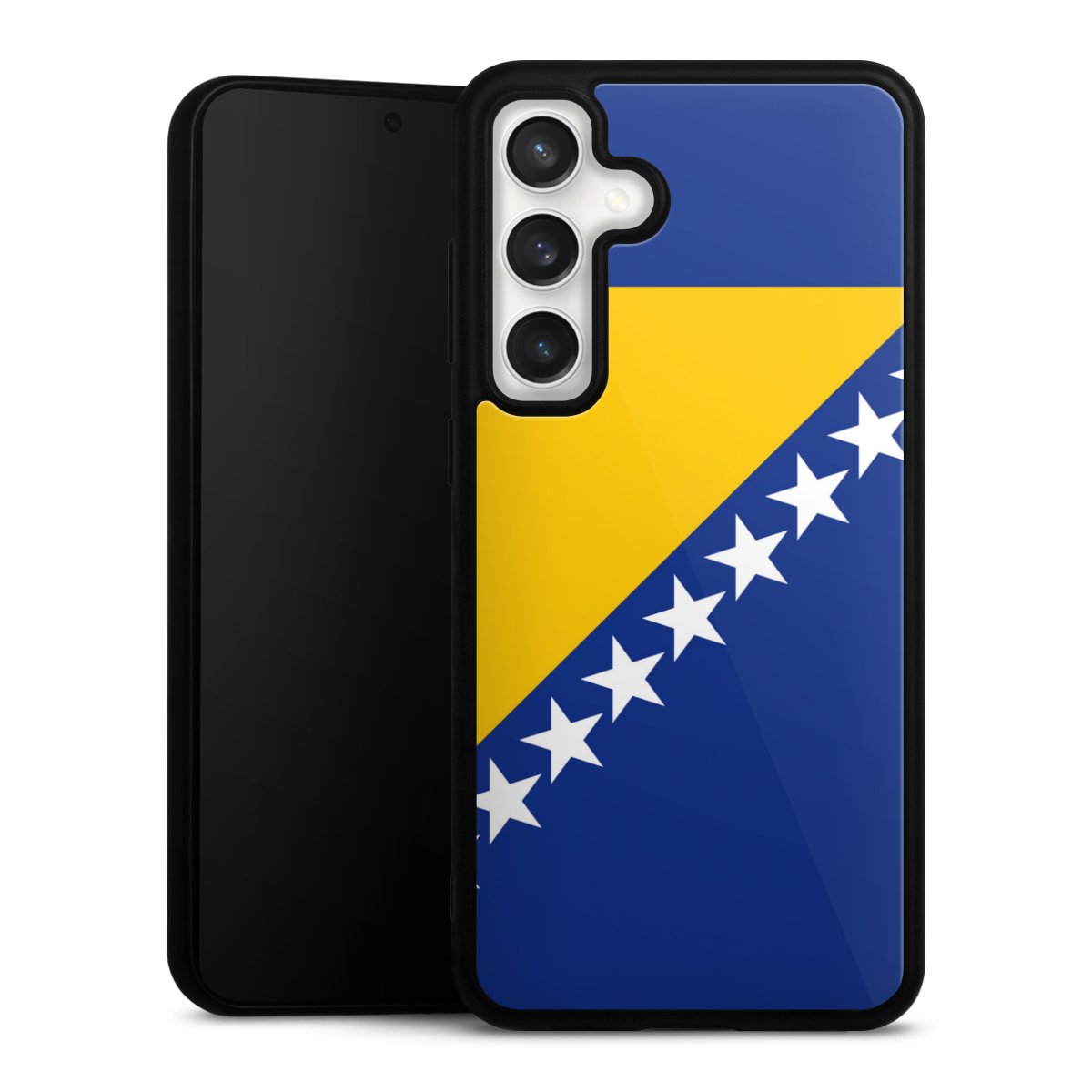 We print your design on the back of the glass inlay and then connect it firmly to the silicone case ,so that nothing sticks out and everything looks like it was cast from one piece. In addition, the sturdy glass element is protected from scratches by an additional coating and ensures a slight reflection on the shiny print image.