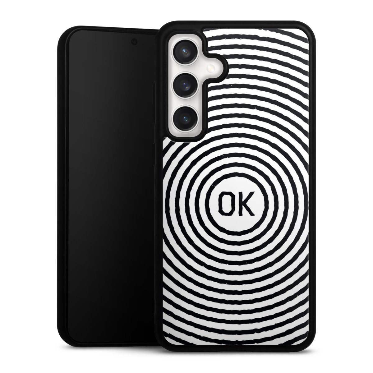 We print your design on the back of the glass inlay and then connect it firmly to the silicone case ,so that nothing sticks out and everything looks like it was cast from one piece. In addition, the sturdy glass element is protected from scratches by an additional coating and ensures a slight reflection on the shiny print image.