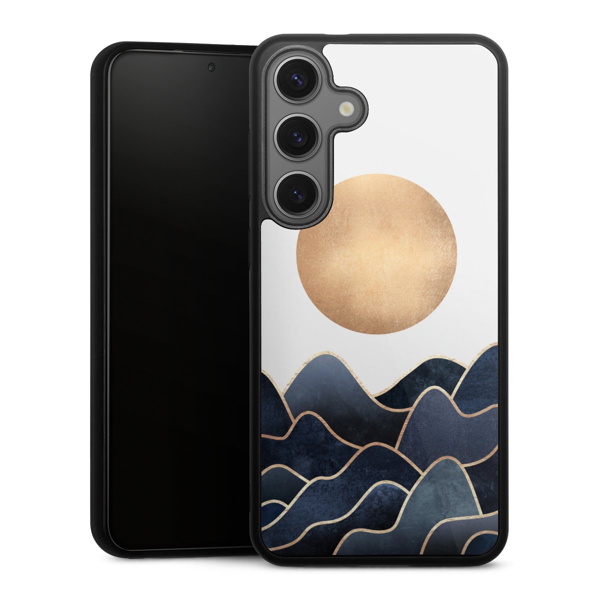 We print your design on the back of the glass inlay and then connect it firmly to the silicone case ,so that nothing sticks out and everything looks like it was cast from one piece. In addition, the sturdy glass element is protected from scratches by an additional coating and ensures a slight reflection on the shiny print image.