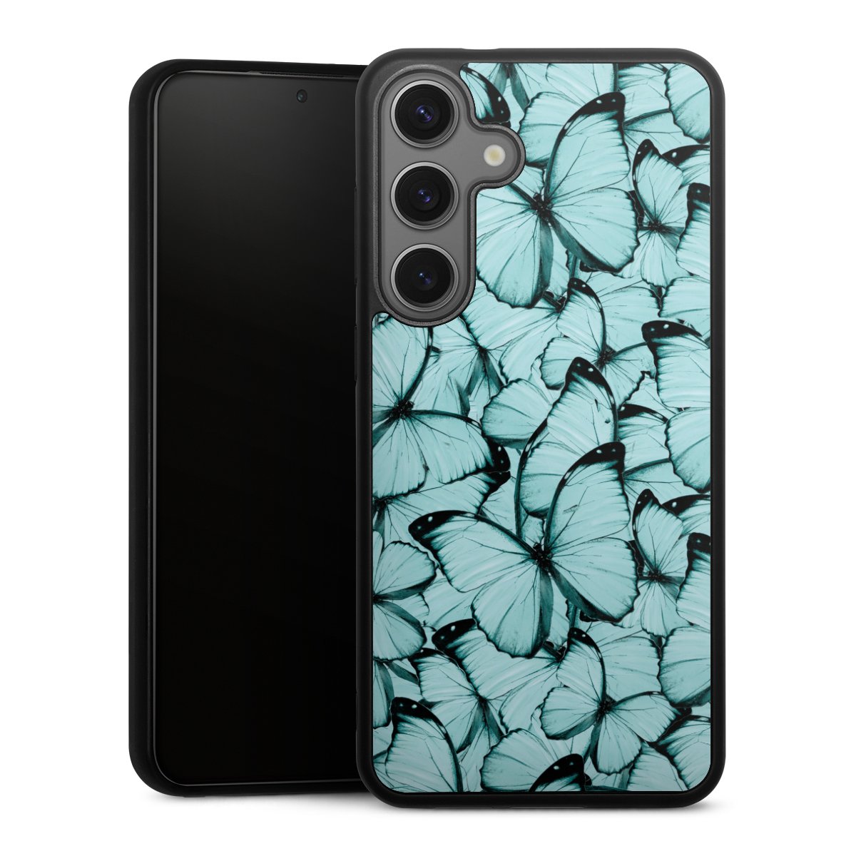 We print your design on the back of the glass inlay and then connect it firmly to the silicone case ,so that nothing sticks out and everything looks like it was cast from one piece. In addition, the sturdy glass element is protected from scratches by an additional coating and ensures a slight reflection on the shiny print image.