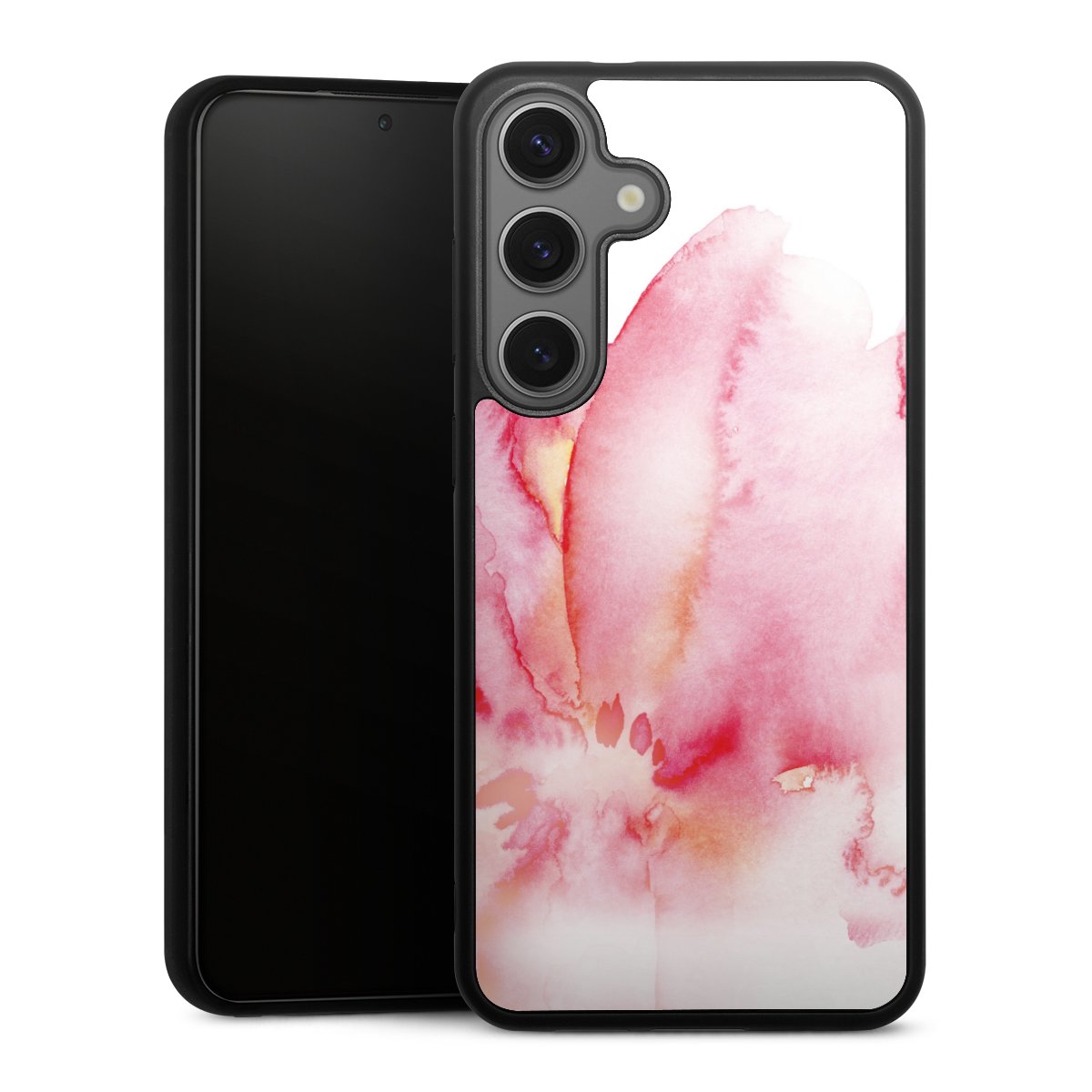 We print your design on the back of the glass inlay and then connect it firmly to the silicone case ,so that nothing sticks out and everything looks like it was cast from one piece. In addition, the sturdy glass element is protected from scratches by an additional coating and ensures a slight reflection on the shiny print image.