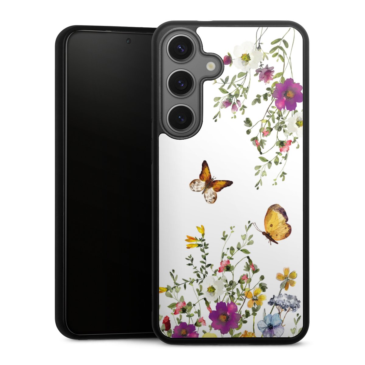 We print your design on the back of the glass inlay and then connect it firmly to the silicone case ,so that nothing sticks out and everything looks like it was cast from one piece. In addition, the sturdy glass element is protected from scratches by an additional coating and ensures a slight reflection on the shiny print image.