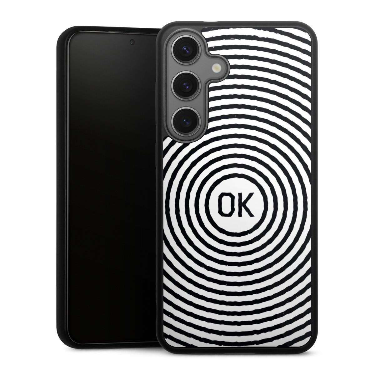 We print your design on the back of the glass inlay and then connect it firmly to the silicone case ,so that nothing sticks out and everything looks like it was cast from one piece. In addition, the sturdy glass element is protected from scratches by an additional coating and ensures a slight reflection on the shiny print image.