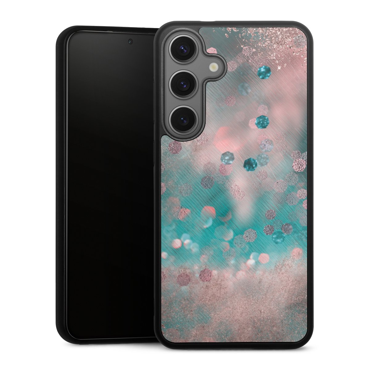 We print your design on the back of the glass inlay and then connect it firmly to the silicone case ,so that nothing sticks out and everything looks like it was cast from one piece. In addition, the sturdy glass element is protected from scratches by an additional coating and ensures a slight reflection on the shiny print image.