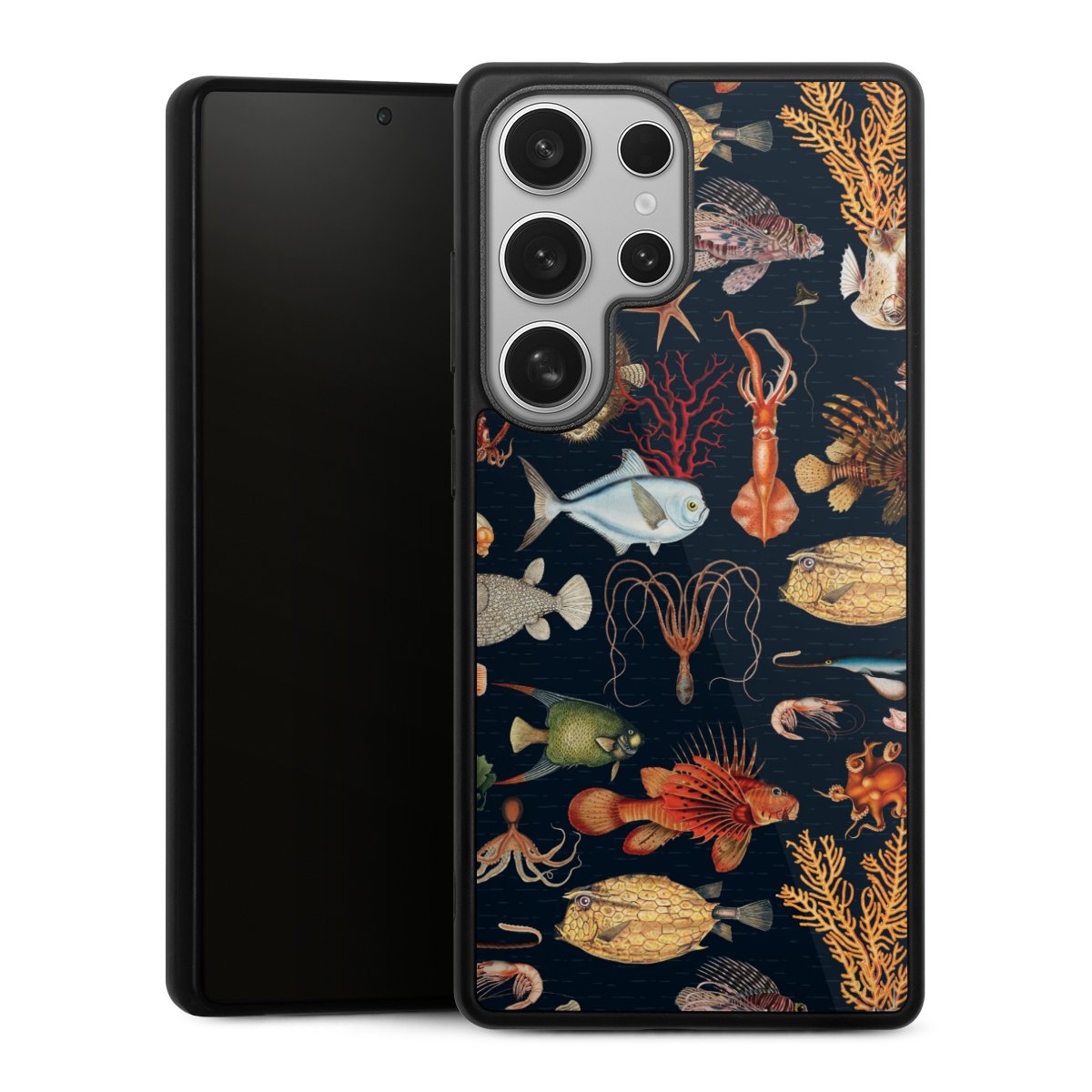 We print your design on the back of the glass inlay and then connect it firmly to the silicone case ,so that nothing sticks out and everything looks like it was cast from one piece. In addition, the sturdy glass element is protected from scratches by an additional coating and ensures a slight reflection on the shiny print image.