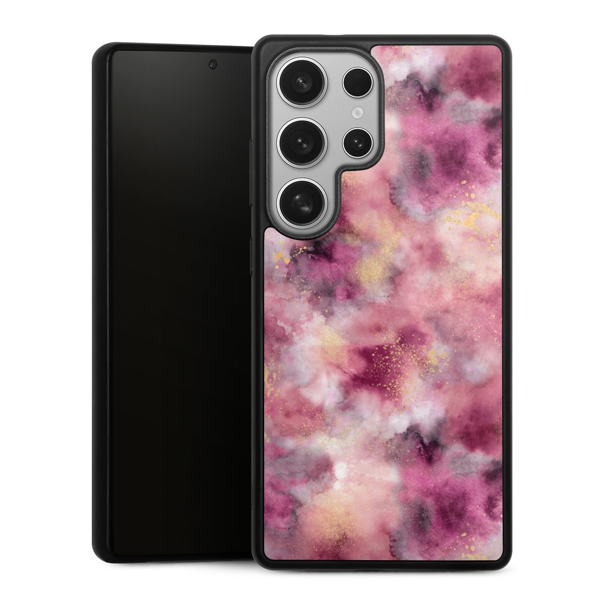 We print your design on the back of the glass inlay and then connect it firmly to the silicone case ,so that nothing sticks out and everything looks like it was cast from one piece. In addition, the sturdy glass element is protected from scratches by an additional coating and ensures a slight reflection on the shiny print image.