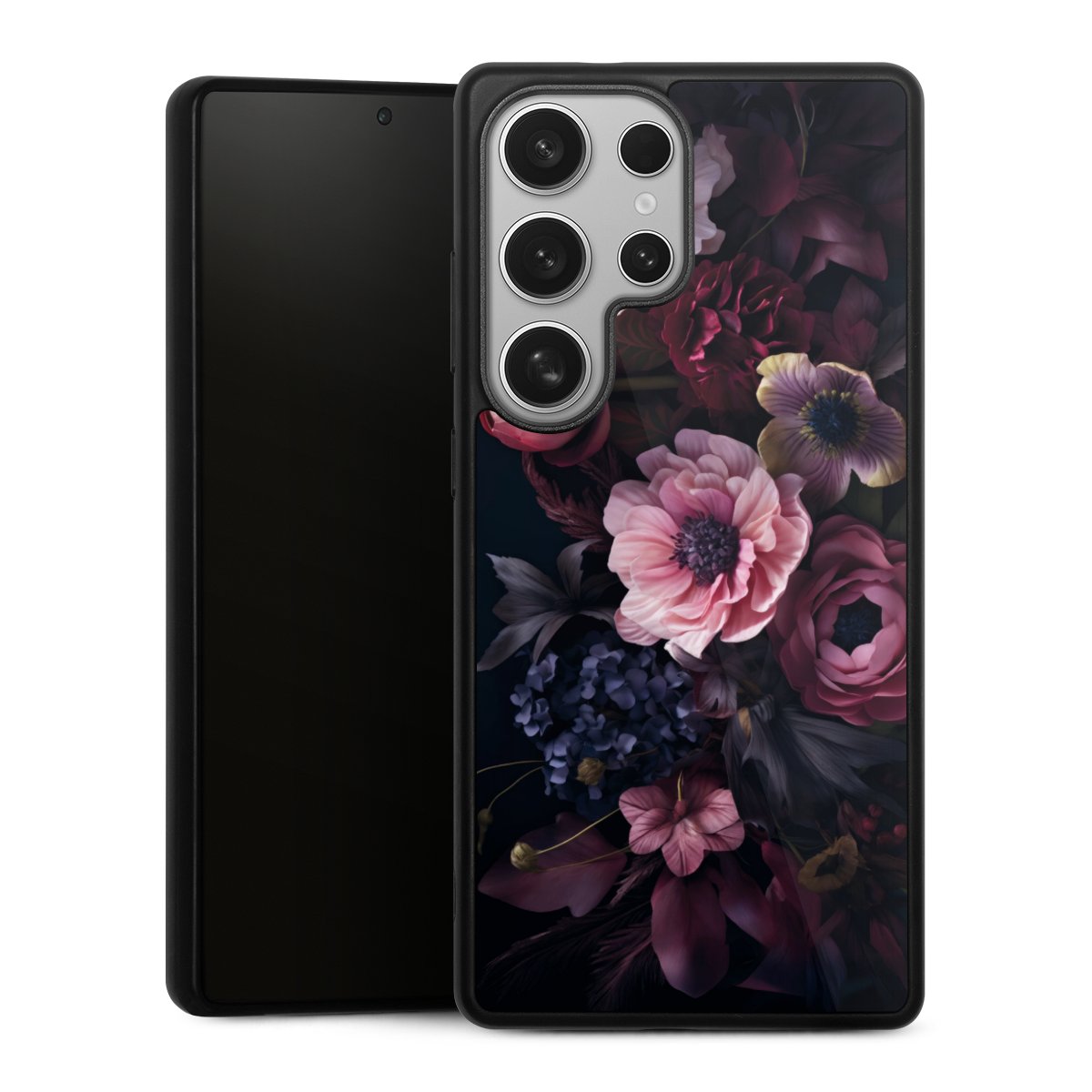 We print your design on the back of the glass inlay and then connect it firmly to the silicone case ,so that nothing sticks out and everything looks like it was cast from one piece. In addition, the sturdy glass element is protected from scratches by an additional coating and ensures a slight reflection on the shiny print image.