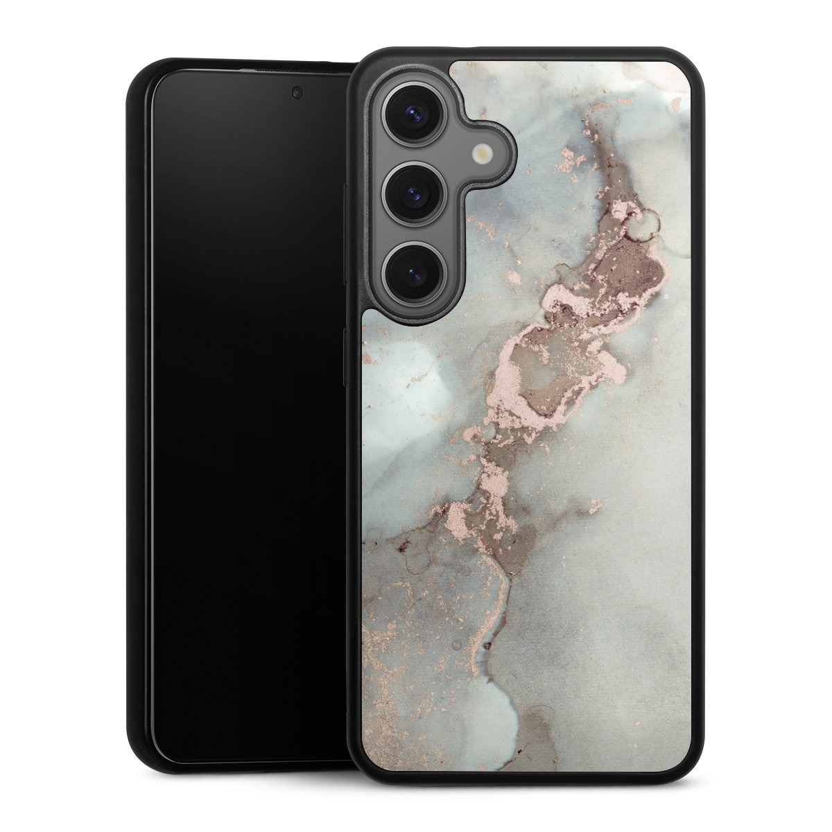 We print your design on the back of the glass inlay and then connect it firmly to the silicone case ,so that nothing sticks out and everything looks like it was cast from one piece. In addition, the sturdy glass element is protected from scratches by an additional coating and ensures a slight reflection on the shiny print image.