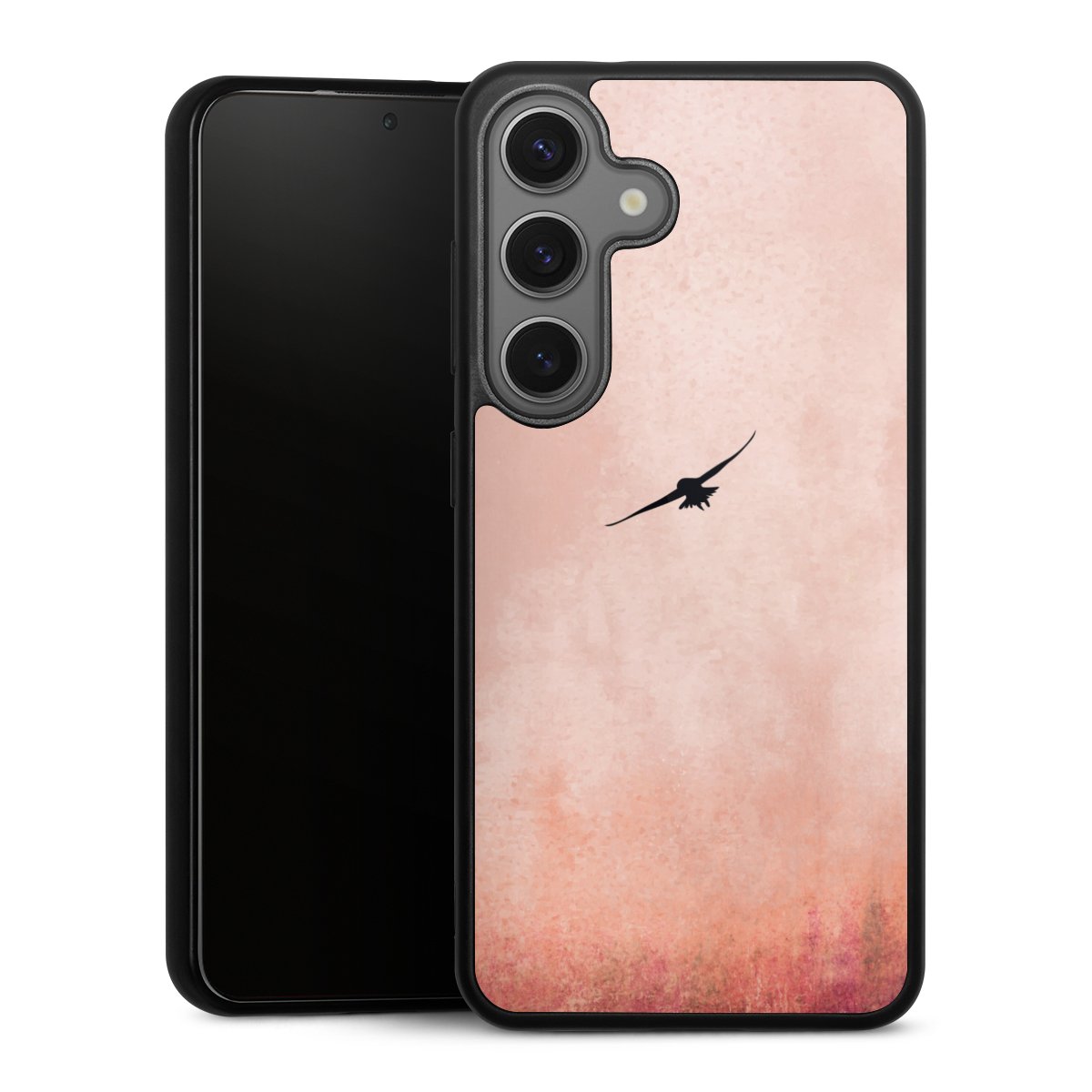 We print your design on the back of the glass inlay and then connect it firmly to the silicone case ,so that nothing sticks out and everything looks like it was cast from one piece. In addition, the sturdy glass element is protected from scratches by an additional coating and ensures a slight reflection on the shiny print image.