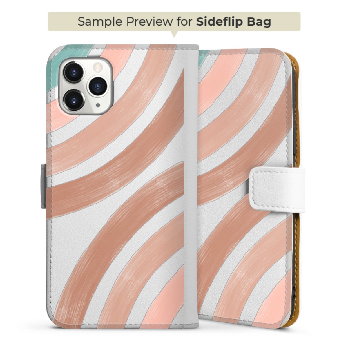 For our Sideflip Case we are using our advanced direct printing technology. The back and frontside are fully printabale, the inside of the phone bag is left unprinted. You can order the phone case without print, printed completely or also with a partial print.