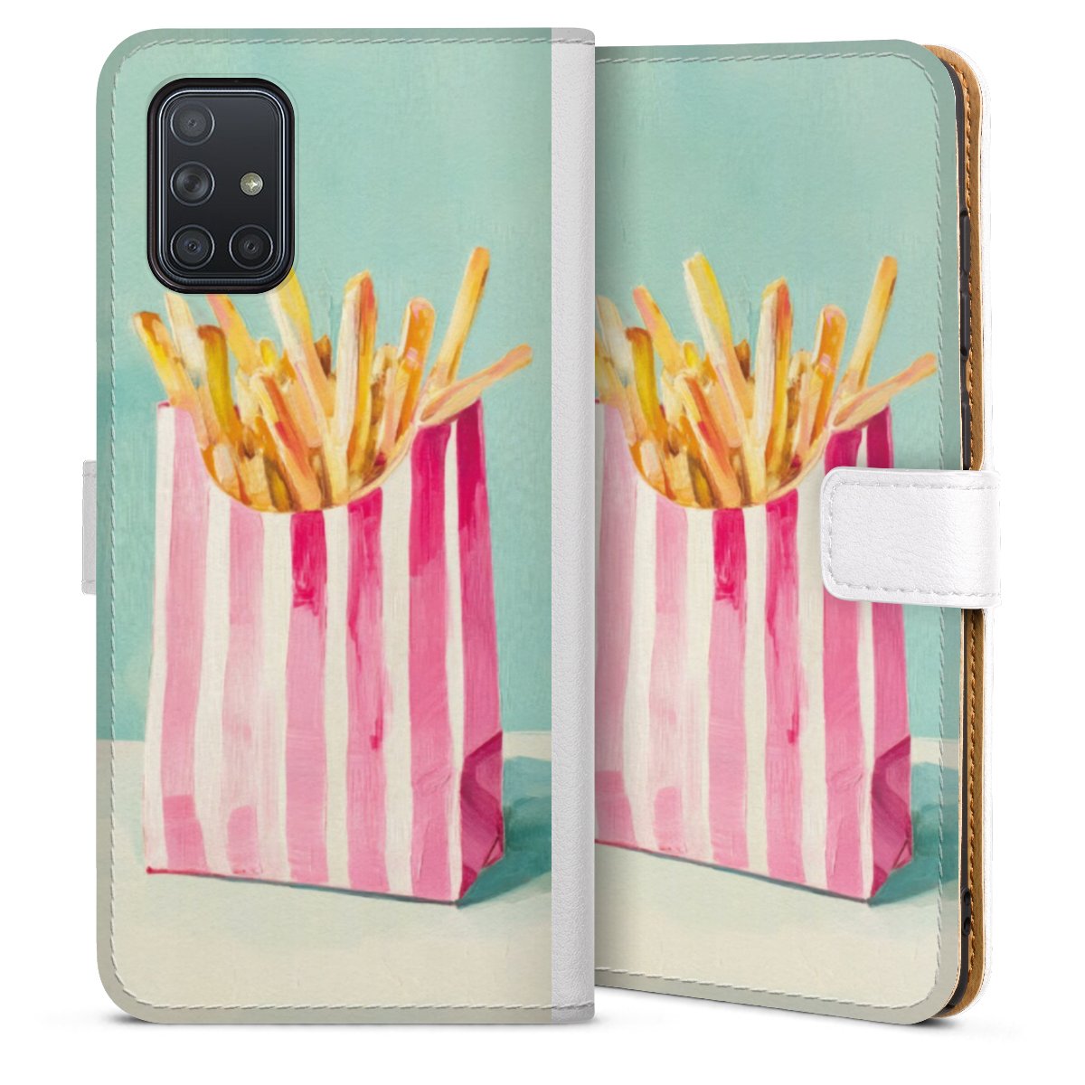 For our Sideflip Case we are using our advanced direct printing technology. The back and frontside are fully printabale, the inside of the phone bag is left unprinted. You can order the phone case without print, printed completely or also with a partial print.