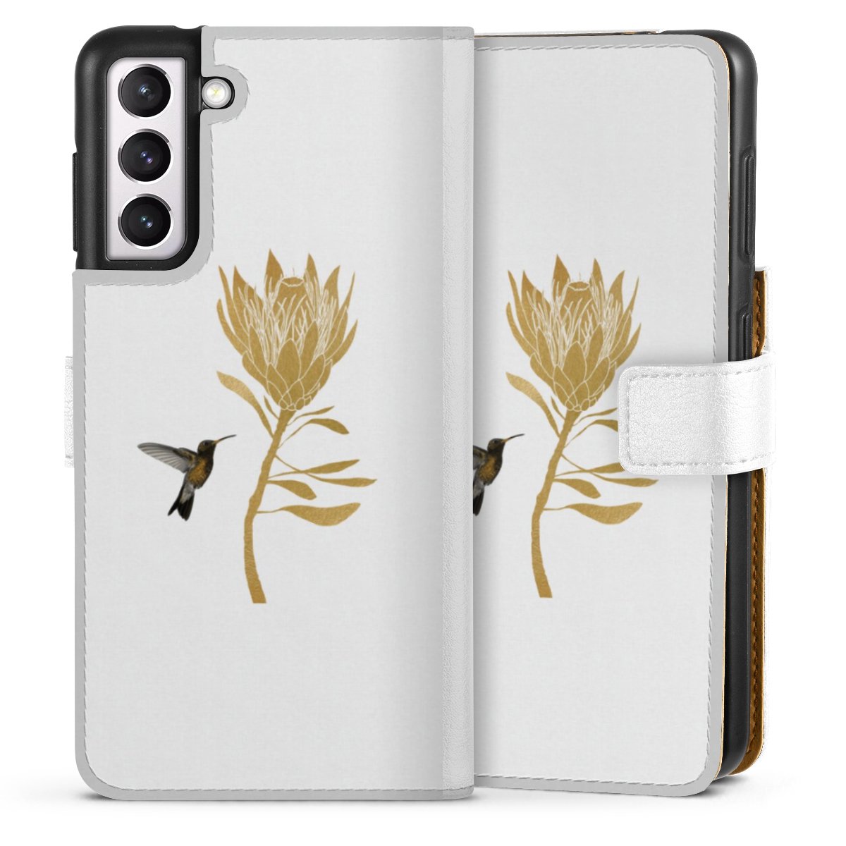 For our Sideflip Case we are using our advanced direct printing technology. The back and frontside are fully printabale, the inside of the phone bag is left unprinted. You can order the phone case without print, printed completely or also with a partial print.