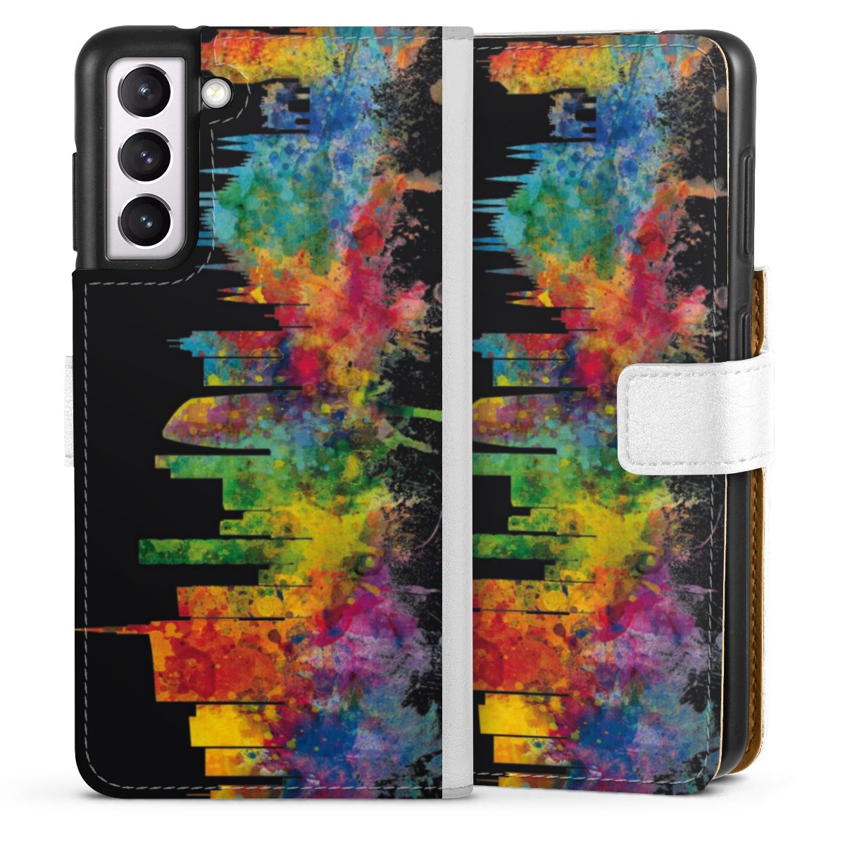 For our Sideflip Case we are using our advanced direct printing technology. The back and frontside are fully printabale, the inside of the phone bag is left unprinted. You can order the phone case without print, printed completely or also with a partial print.