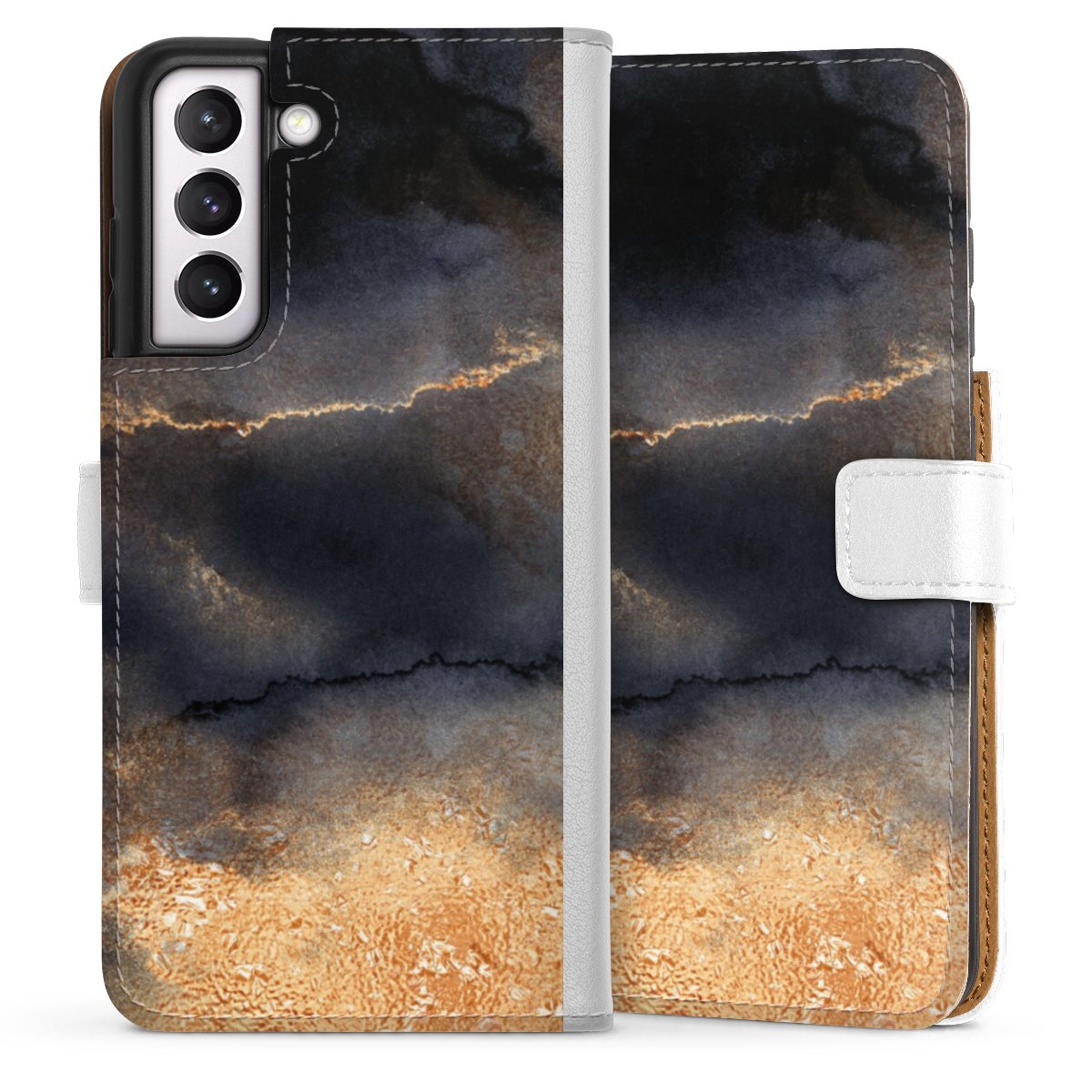 For our Sideflip Case we are using our advanced direct printing technology. The back and frontside are fully printabale, the inside of the phone bag is left unprinted. You can order the phone case without print, printed completely or also with a partial print.