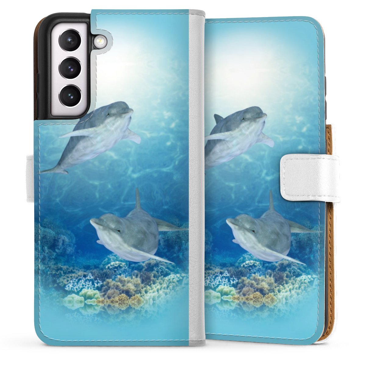 For our Sideflip Case we are using our advanced direct printing technology. The back and frontside are fully printabale, the inside of the phone bag is left unprinted. You can order the phone case without print, printed completely or also with a partial print.