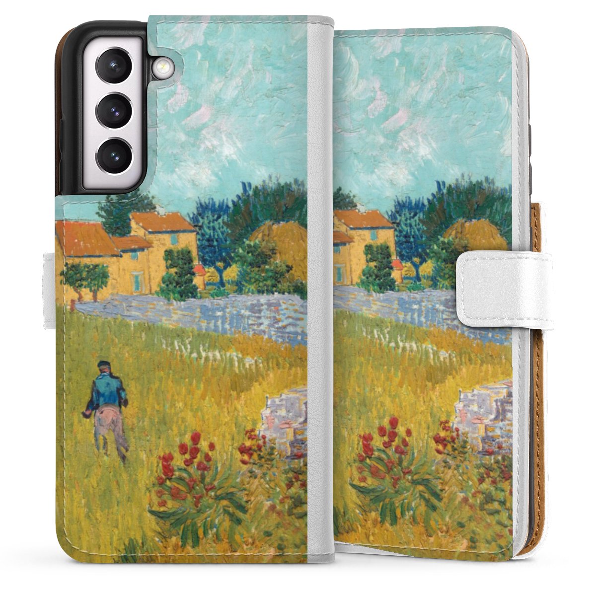 For our Sideflip Case we are using our advanced direct printing technology. The back and frontside are fully printabale, the inside of the phone bag is left unprinted. You can order the phone case without print, printed completely or also with a partial print.