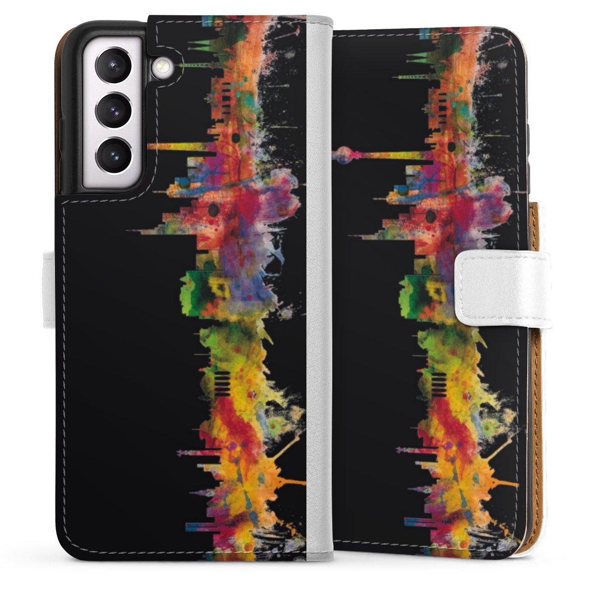 For our Sideflip Case we are using our advanced direct printing technology. The back and frontside are fully printabale, the inside of the phone bag is left unprinted. You can order the phone case without print, printed completely or also with a partial print.