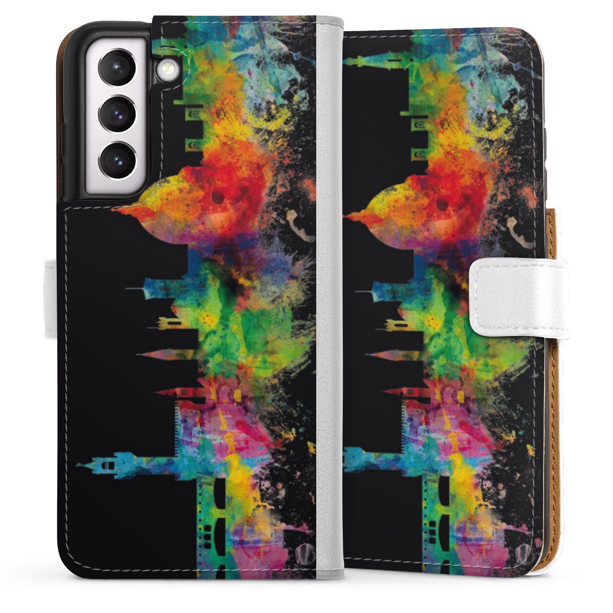 For our Sideflip Case we are using our advanced direct printing technology. The back and frontside are fully printabale, the inside of the phone bag is left unprinted. You can order the phone case without print, printed completely or also with a partial print.