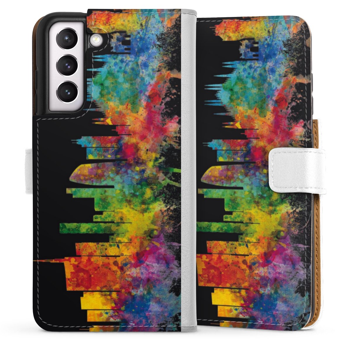 For our Sideflip Case we are using our advanced direct printing technology. The back and frontside are fully printabale, the inside of the phone bag is left unprinted. You can order the phone case without print, printed completely or also with a partial print.