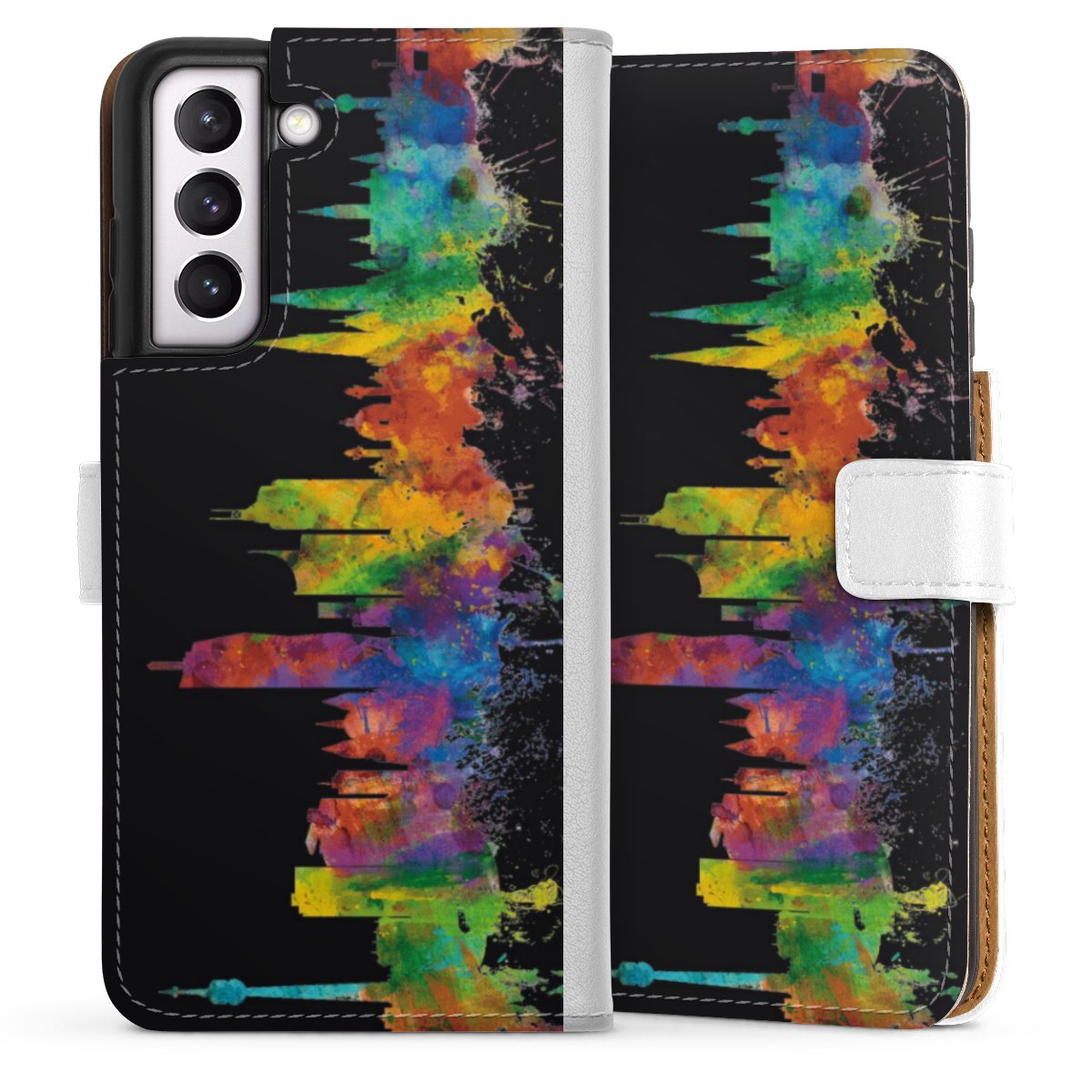 For our Sideflip Case we are using our advanced direct printing technology. The back and frontside are fully printabale, the inside of the phone bag is left unprinted. You can order the phone case without print, printed completely or also with a partial print.
