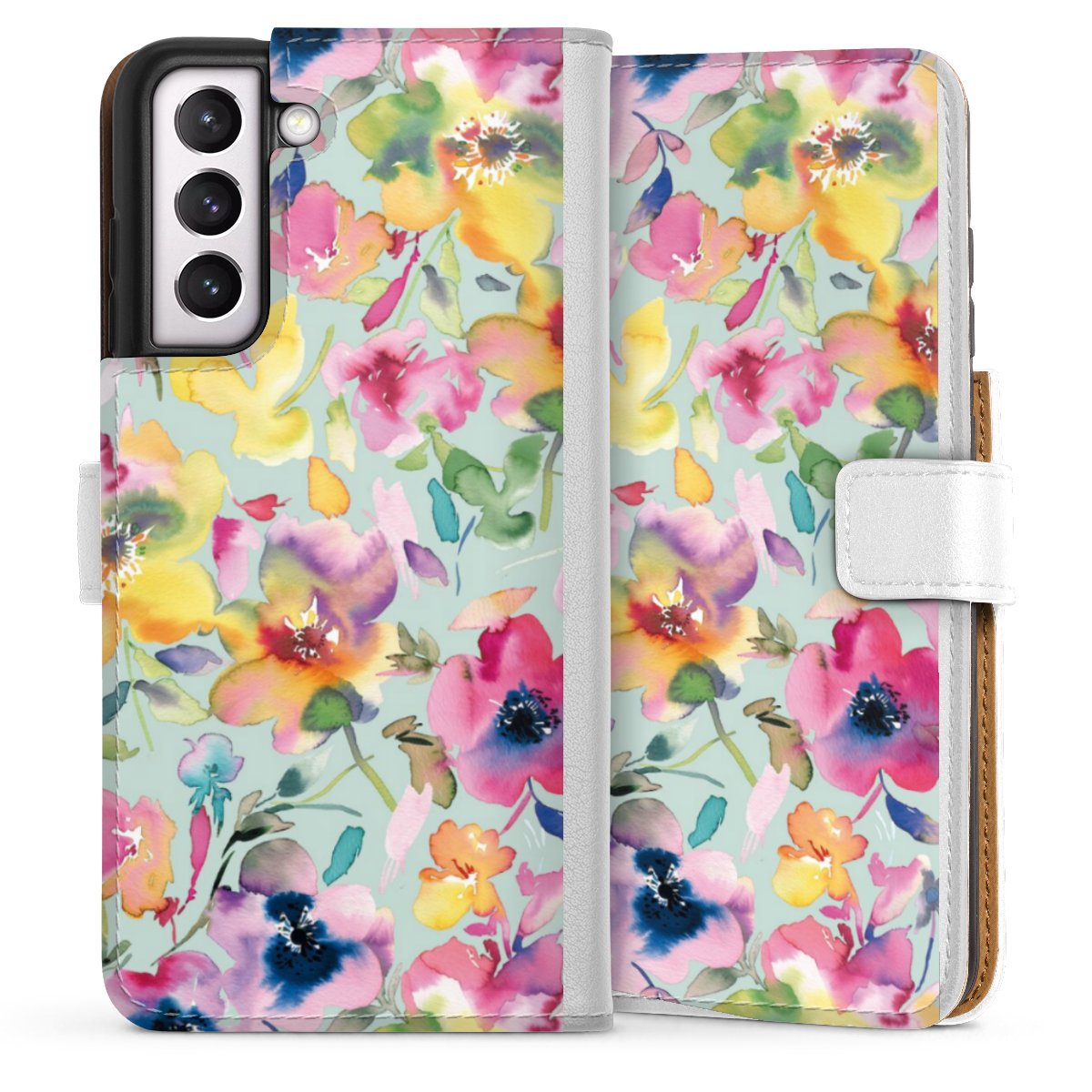 For our Sideflip Case we are using our advanced direct printing technology. The back and frontside are fully printabale, the inside of the phone bag is left unprinted. You can order the phone case without print, printed completely or also with a partial print.
