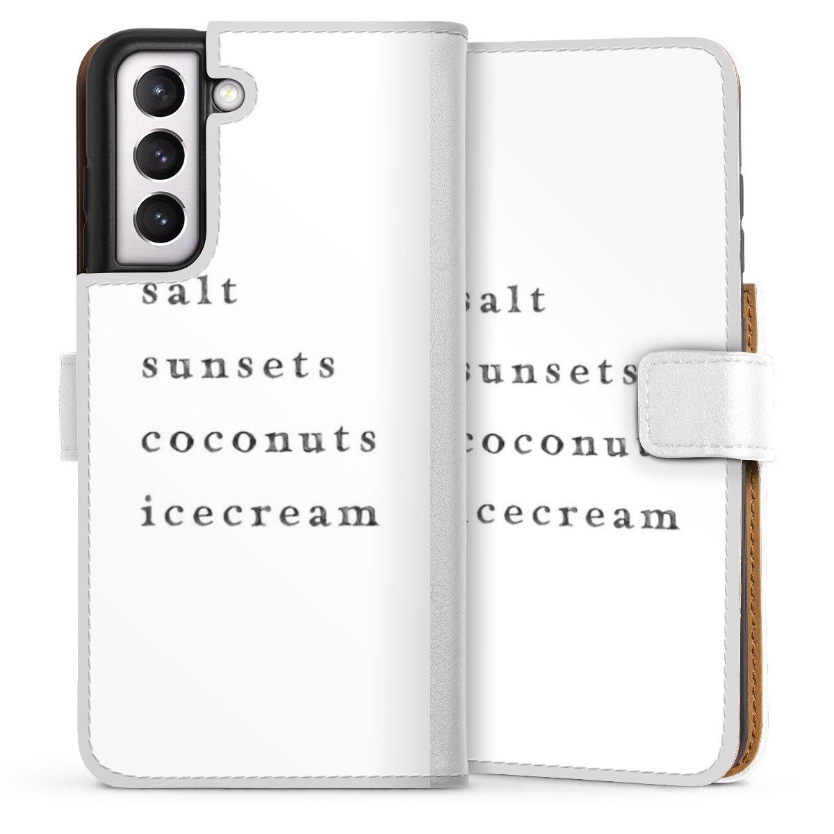 For our Sideflip Case we are using our advanced direct printing technology. The back and frontside are fully printabale, the inside of the phone bag is left unprinted. You can order the phone case without print, printed completely or also with a partial print.