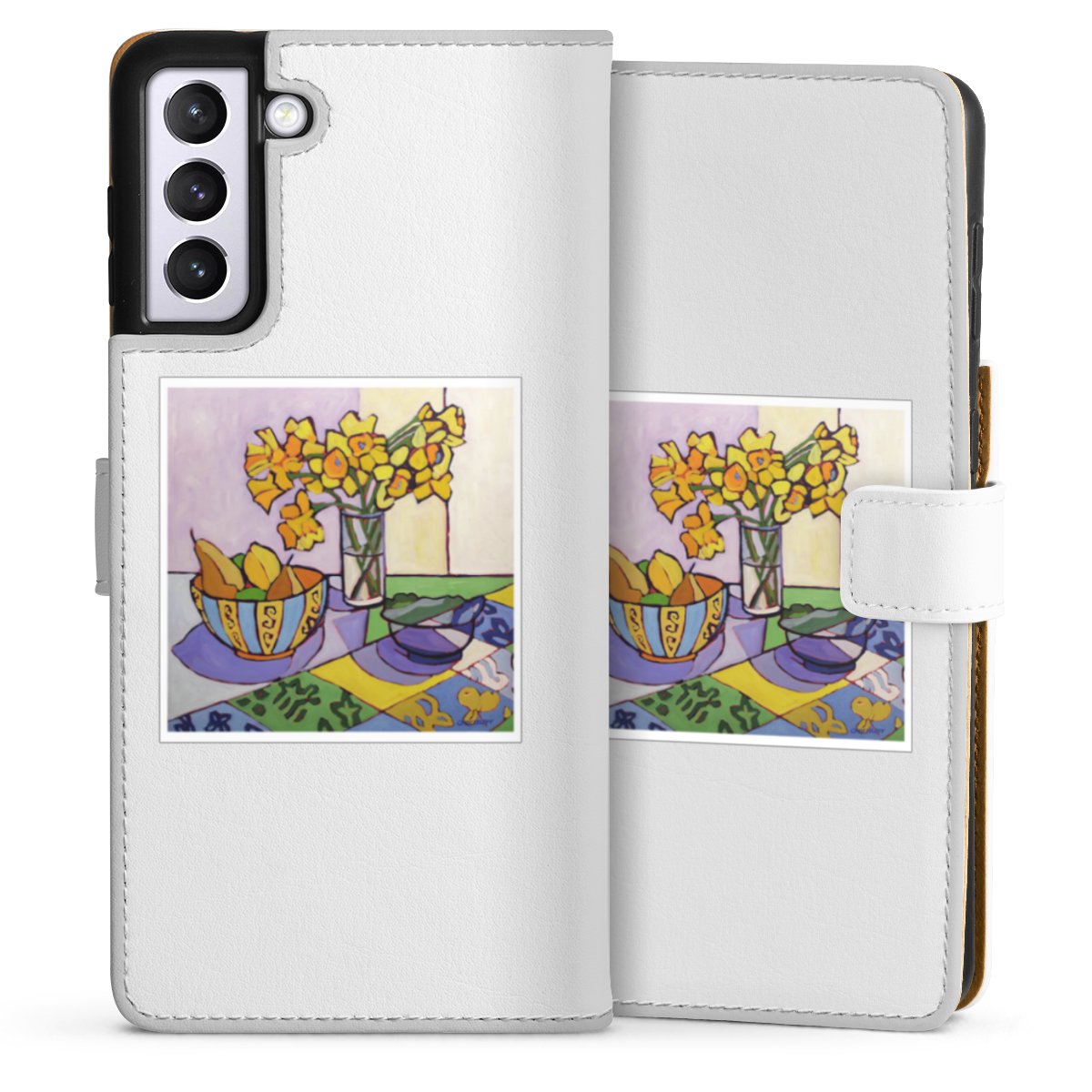 For our Sideflip Case we are using our advanced direct printing technology. The back and frontside are fully printabale, the inside of the phone bag is left unprinted. You can order the phone case without print, printed completely or also with a partial print.