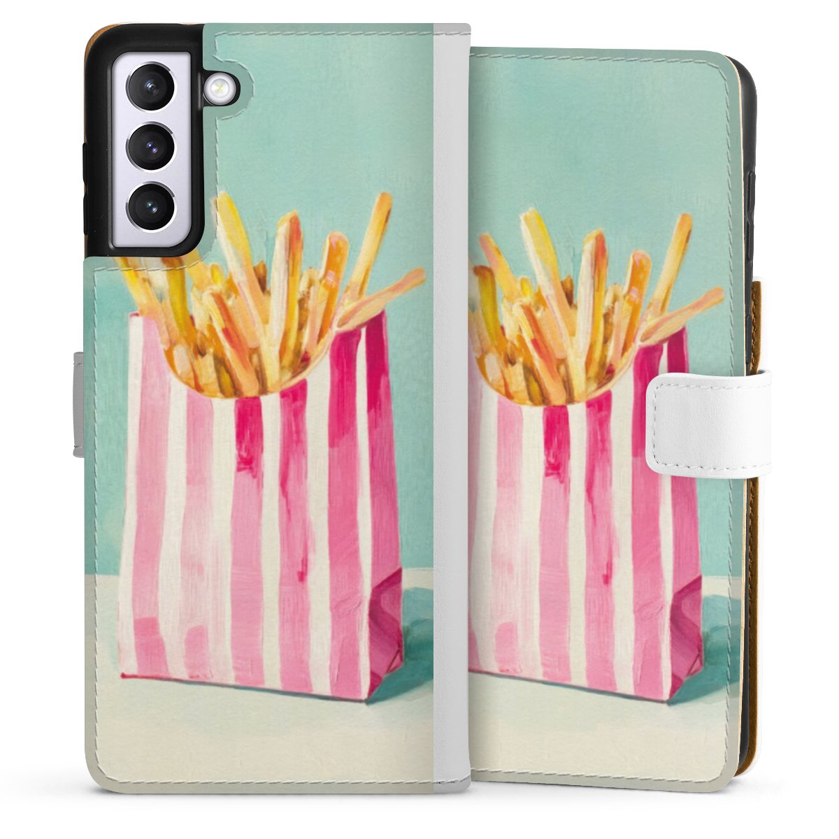 For our Sideflip Case we are using our advanced direct printing technology. The back and frontside are fully printabale, the inside of the phone bag is left unprinted. You can order the phone case without print, printed completely or also with a partial print.