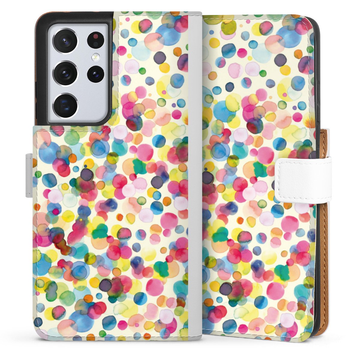 For our Sideflip Case we are using our advanced direct printing technology. The back and frontside are fully printabale, the inside of the phone bag is left unprinted. You can order the phone case without print, printed completely or also with a partial print.