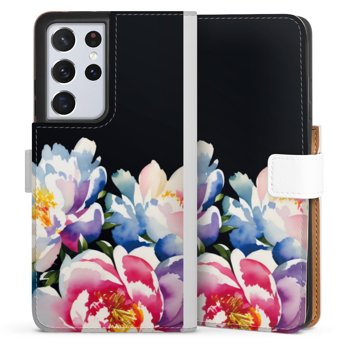 For our Sideflip Case we are using our advanced direct printing technology. The back and frontside are fully printabale, the inside of the phone bag is left unprinted. You can order the phone case without print, printed completely or also with a partial print.