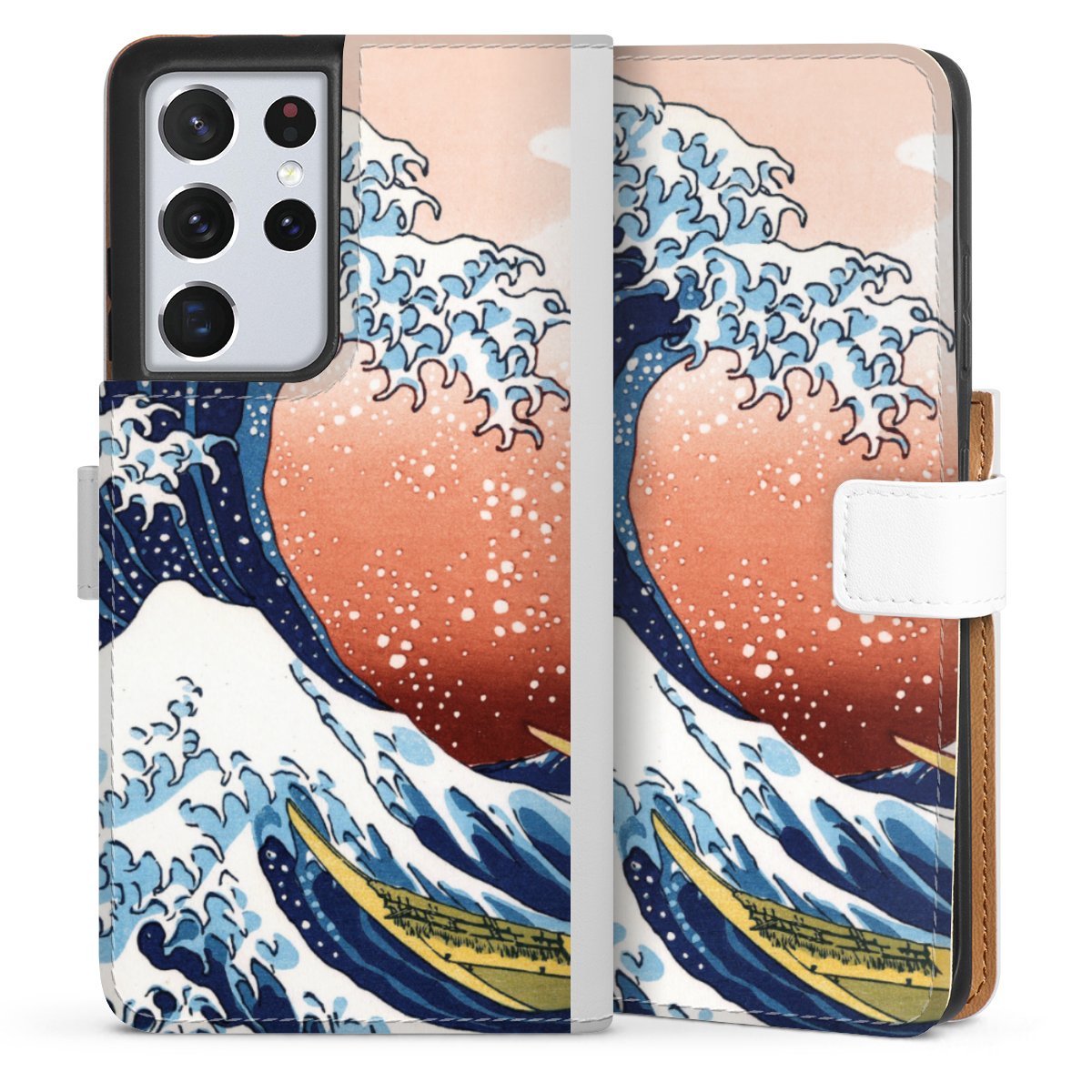 For our Sideflip Case we are using our advanced direct printing technology. The back and frontside are fully printabale, the inside of the phone bag is left unprinted. You can order the phone case without print, printed completely or also with a partial print.