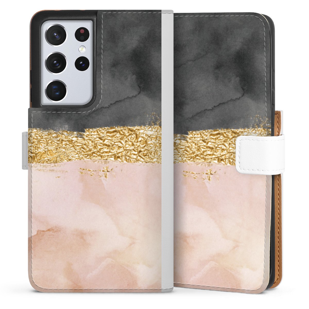 For our Sideflip Case we are using our advanced direct printing technology. The back and frontside are fully printabale, the inside of the phone bag is left unprinted. You can order the phone case without print, printed completely or also with a partial print.