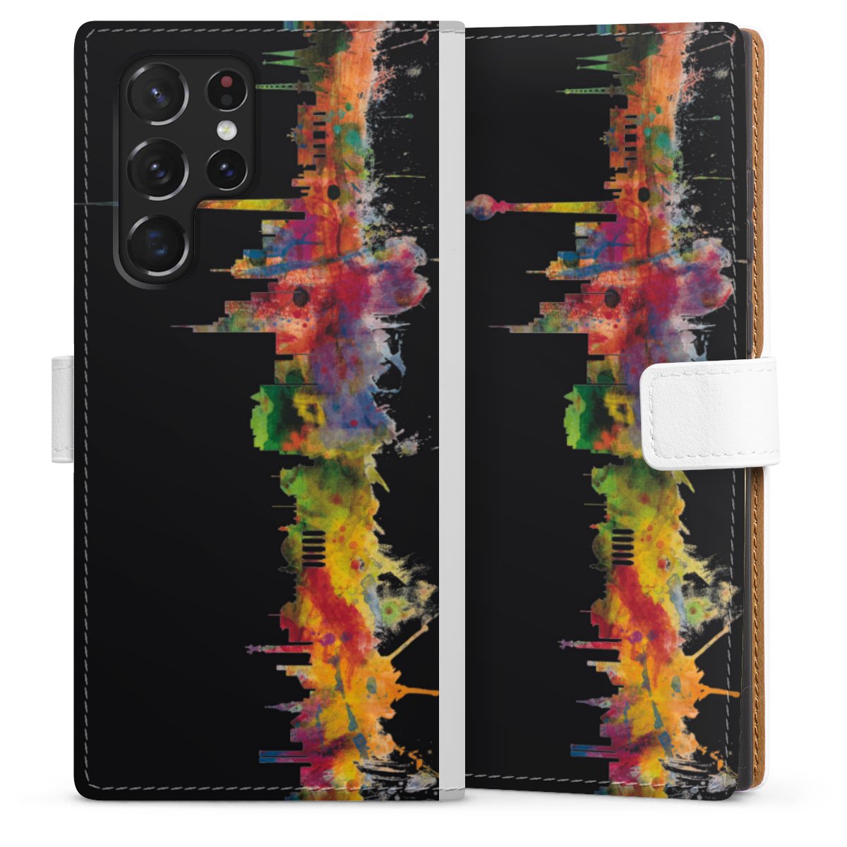 For our Sideflip Case we are using our advanced direct printing technology. The back and frontside are fully printabale, the inside of the phone bag is left unprinted. You can order the phone case without print, printed completely or also with a partial print.