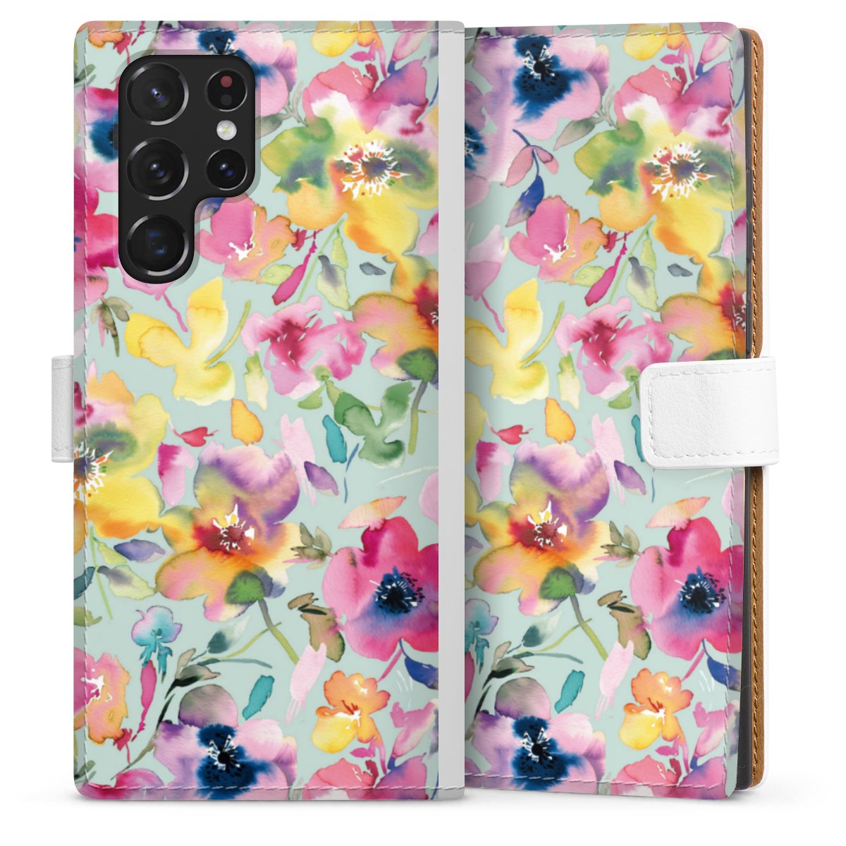 For our Sideflip Case we are using our advanced direct printing technology. The back and frontside are fully printabale, the inside of the phone bag is left unprinted. You can order the phone case without print, printed completely or also with a partial print.